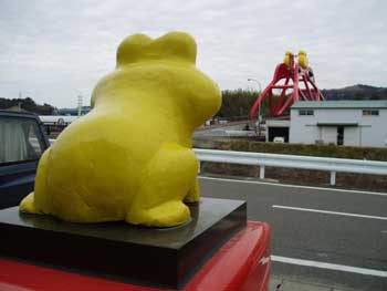 高速道路が2003(平成15年)12月14日開通しました。待望の高速を走ると印南町へ… ”かえる橋”がドドン〜と顔を出す。橋の上に乗っかったかえるの顔を見ると思わず笑ってしまうユーモラスな橋。 かえる橋は、印南駅北側のJRきのくに線の上に架かっている陸橋です。”ふるさと創生1億円事業”を使った全国に類を見ない「かえるをテーマ」に平成7年3月完成した。 なぜ、かえるなのか…努力・忍耐、そして飛躍を象徴して、橋の欄干には、かえるにひっかけた ”いなみかえる 5か条”と草野心平の ”かえるの歌”が刻まれている。 |