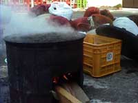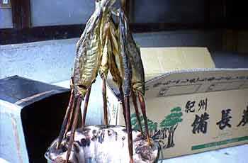 | あゆを七輪に串刺し缶をかぶせて備長炭で、六時間燻製にします、保存食として、とても美味しい。 |