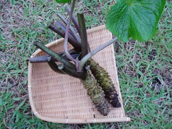自然薯(山芋)…一本で、四kg有りました、こんなに大きいのは、私は、初めて掘りました。 早速、あゆの燻製を出汁にして、とろろ汁を作り食べました。 |