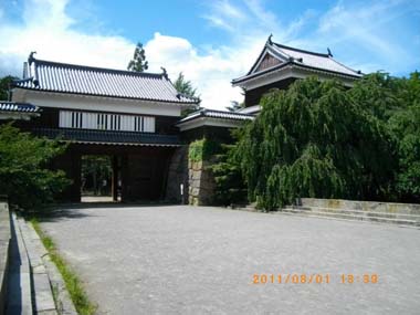 南北櫓(68年9月) 東虎口櫓門と北櫓(2011年8月K氏撮影) 上田駅に着く2、3分前「左側に見えるのが、上田城跡でございます」という車内アナンスをしたので見ると、なるほど「上田城跡」と、白い文字があり、その高台には櫓も見える。駅を下りて一番近い道順をたどって、城跡虎の口に着いた。夕暮れ近く、西の山々の影に太陽も無くなりかけ、その赤い残光の中に、二つの櫓が浮かびあがり、黒々としてどっしりと落ち着きのある形。二層の左右の櫓は、同じような形、大きさである。堀に写った姿、木間越しの姿など、短い残照を惜しむ様に。左右の櫓の建っている場所から神社を通り、裏手の方へ。そこにも一つ、二層の同じような櫓が建っていた。こちらのは一つ寂しそうに、夕焼けに顔を染めていた。堀の周りを又裏口の方に、ゆっくりと歩いてみる。小高い丘になっている本丸跡は、真田幸村が徳川秀忠の大軍を前に、おおいに戦った事もある。その城も破却の運命にあい、寛永三年に仙石忠政が再築。その時の櫓なのか、それとも後の時代のものなのであろうか。三基のうち二基の櫓は、上田の遊郭となっていたのを、買い戻したもの。昌幸、幸村、信之がありし日の面影を求めようとすれば、どこに求めたらいいのであろうか。上田の町にある空気を、土を、水を、それらにしか求められないのであろうか。信州上田城ありし日、そこは猿飛佐助などの忍者も活躍した事なのであろうか。(68年9月) |
