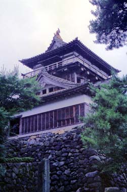 天守閣(71年6月) 小高い丘の上に、ぽっかりと小さな天守閣が、顔を覗かせていた。遠くからでも、向こうの山の上に、見つける事が出来た。犬山城の天守とならんで、古いこの丸岡の天守、当然、戦国の世のものであろうし、実戦にもなったのかも知れず、町の中の山城となっている。信長が一向一揆を平定し、柴田勝家がその守護となった時、甥の勝豊が天正4年に、この丸岡に築城したのが始まり。町に入り、中心街らしい通りを行くと、その城の麓に出る。狭い道を、その山裾沿いに回ると、裏手の方に駐車場がある。2、3台の車があった。そこから天守閣のある丘の方へ、階段を上がって行く。少し行くと、その右手に遊園地があり、そこから左手に、天守閣が木々の上に頭を出している。総ての屋根瓦が、石で出来ているせいか、全体にしっとりとした灰色で、いかにも北陸の、雪の中で経てきた年月を感じさせるようである。入り口の長い石段を上り、内部へ。大きくない一階、二階、三階で、急な階段がついている。外観二層のせいで、二階は狭い中二階だろうと思っていたが、案外に一階から三階までの部屋の高さは、同じぐらいである。石落としや狭間があるところからみて、最終的には戦うつもりなのだろうが、実際はだめだろう。狭すぎる室内には、何日もいる事が出来ない。それよりもむしろ望楼、倉庫として、その建物の偉容さを誇っただけの、非戦闘的な天守閣に見える。最上段には欄干がまわっているが、とてもそこを回るだけの勇気が無い。腐りかけている木々が、足を危なくし、その上、雨に濡れていたのと、何となく小さくて、かわいそうなのである。このあたりは犬山城の、あの天守閣の欄干とは違うし、何となく天守閣自体も、スケールが一回り小さい。だが、その上からの眺めは、格別である。晴れた日ならば、日本海も見渡す事が出来るのではないだろうか。(71年6月) |
