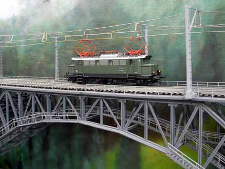 | DR BR E95(BRAWA):6軸駆動,重連,2,418kW,全長20.9m,自重138.5t.ドイツ王立鉄道が1920年代半ばに製作したもので,2,200tの貨物輸送が可能,最高速度は65km/hであった.BRAWA社製で,この会社は細部に異常なほどこだわって作り込む所を特色としていて,写真にあるとおりここまでやるかという感じである.これがまたマニアには堪らない所.あまり細かく作ってあるので扱うのが大変.TRIX製は走行性能を重視し、ダイキャストを採用する。ということは、細部のディテールは犠牲になる。BRAWA製はその反対で、ELも牽引力は大したことがなさそう。それと、あまり細かく作ってあると、走らせている内に小さな部品が脱落して、いったん落ちるといったいどの機関車の部品か分からなくなる事態に立ち至っている. |