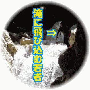 どうも沢登りの若者グループらしく、飛び込みたいが釣り人が居るので困っているようである。 ここは若者に譲ろうと思いルァー竿を仕舞い始めるとさつそく一人が左岸の岩の上に立った。 1、2、3、と数える間も無く若者の姿が消えた、約2秒後に白泡の直ぐ手前にバンダナを巻いた頭が水面に出た。 良かった 良かった! 思わず胸を撫ぜ下ろした。 後の二人も次々に躊躇も無く滝つぼに身を躍らせた。 すごい!