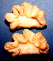 円形にのばし、ひれを二つに折って、とじ目を指先で縄目模様にひっつけたものを菜種油で揚げる。
