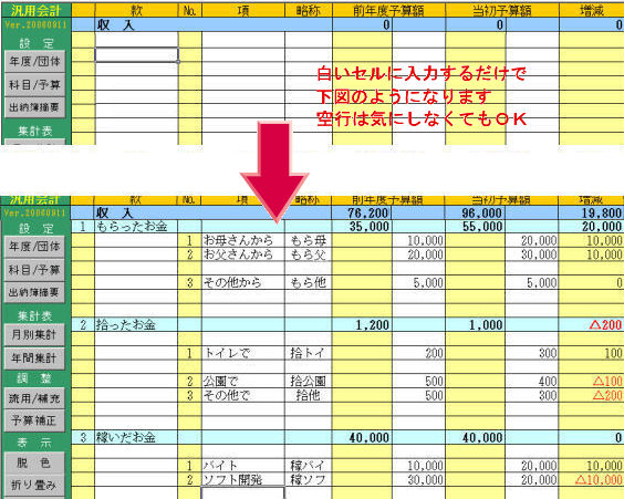 収入、支出の設定に、それぞれ50行が用意されていて、この範囲内で款項を自由に設定できます。