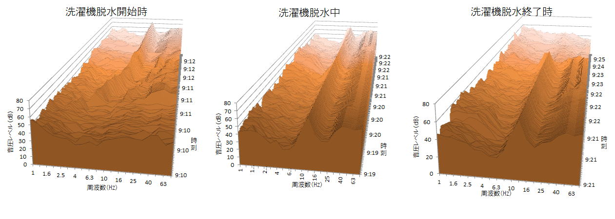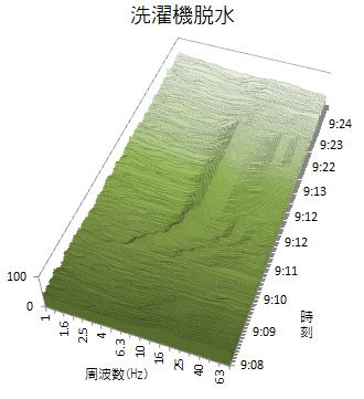 次の図は洗濯機の脱水開始時から脱水終了時までの様子である。脱水が始まるとゆっくりと卓越する周波数が高くなっていく様子がわかる。平原に山や谷が現れ、やがて険しい山や渓谷となり、脱水が終了すると、再び、穏やかな平原に戻る。このように、機械により、目には見えぬが、人工的な空気振動が起こっている。 |