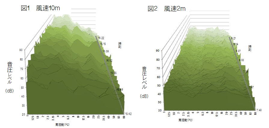 図1は、風の強い日のもので、低周波音は周波数も音圧もランダムに現れ、荒れ狂う海面となり、5Hz以下の周波数が高く、全体に右下がりとなっている。一方、風の弱い時は、無風時では穏やかな海面(図2)の様相で、ほぼ平坦となり、不定形な波が現れる。