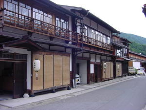 町を構成する町屋の特徴としては、板葺きの石置屋根、切妻平入、そして出梁造(だしばりづくり)と鎧庇(よろいひさし)になります。特に一階と二階の間にある鎧庇は、四、五枚の板をしころに重ね、猿頭という桟木で吊り、それを金具が補強するといったこの地方特有の形態をとっている。