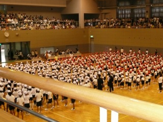 今日は晃志の小学校の運動会だった。しかし、校舎はこの春から耐震補強工事中で、校庭には仮設教室が建っている。また工事用の車両エリアも確保されていて、運動会に校庭が使えない。そこで、運動会は近所(徒歩5分)の市立体育館で行なうことになった。
