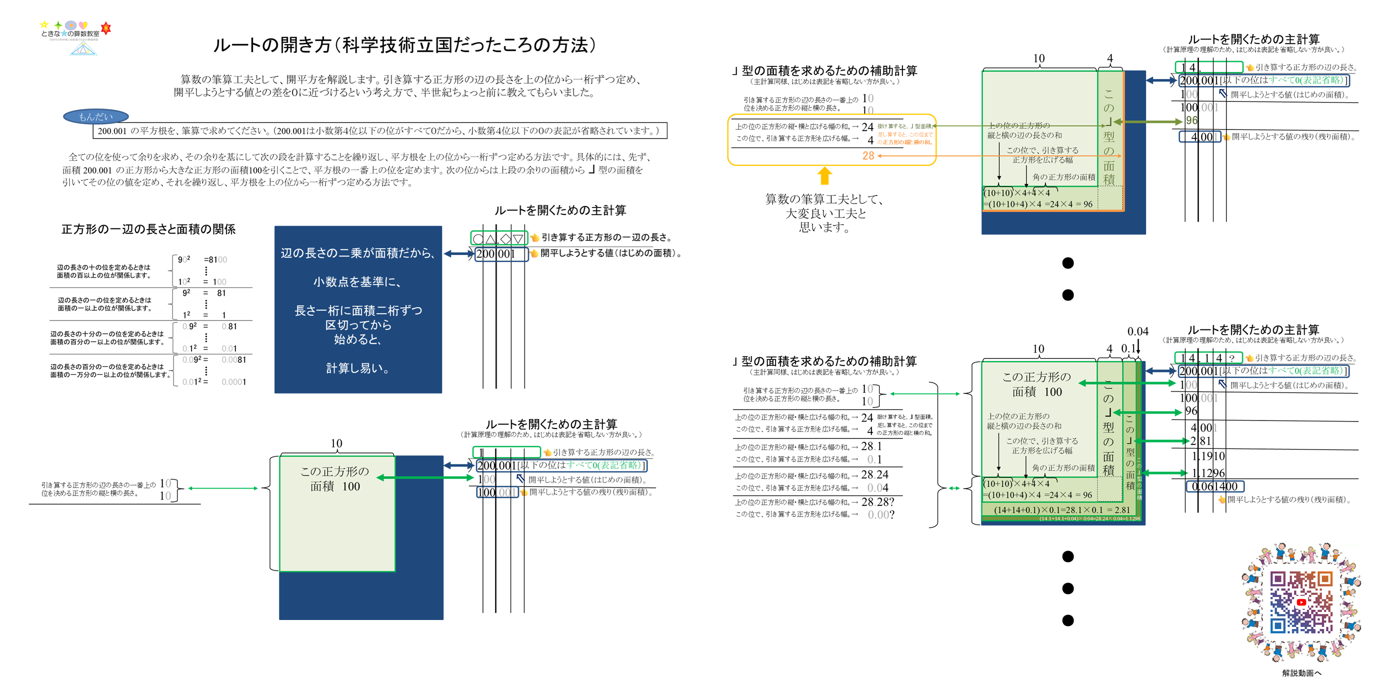 「正方形の図形」と「10進数の性質」の問題として、開平法を算数的に理解する方法です。