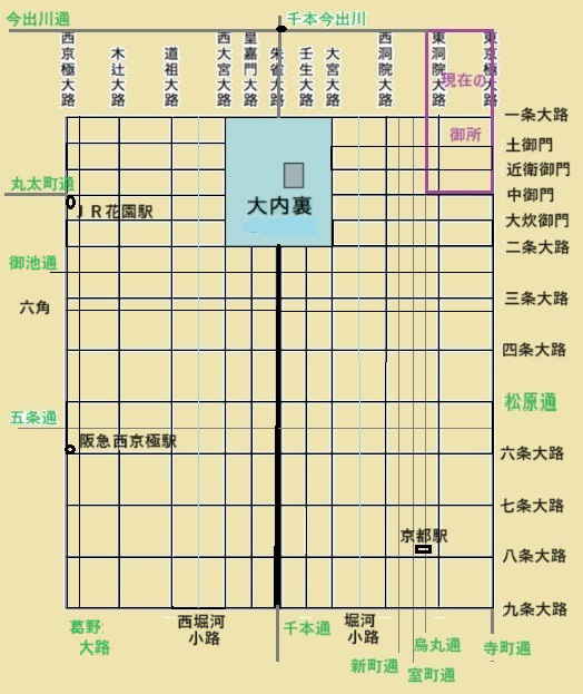 ・大内裏の北は一条大路、南は二条大路と一致、その全体は中央にある。中央通りが朱雀大路(道幅約84m、長さ約4km)で北端に