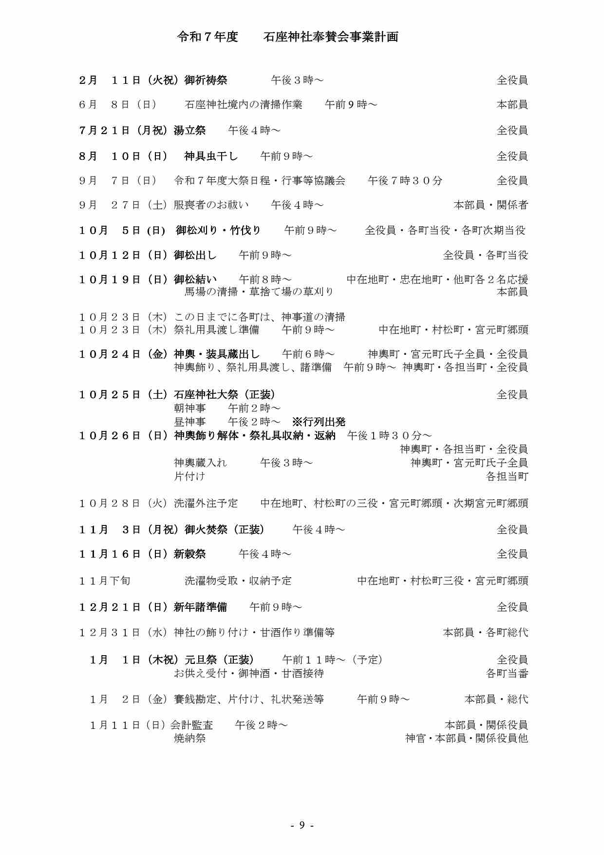 | 9月 7日 | (日) | 午後7時半 | △大祭日程・行事等協議会 | ||||