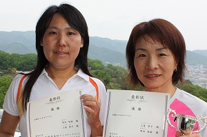 うれしい!! 5連覇だ! もう5年も組んでるんだね〜と、言いながらの試合でした。自分のできることを集中して今回はプレーできたのと、それをさせてくれた岡田さんに感謝×2です。また楽しくプレーしたいです。岡田さんありがとう。 榎本 夕子 やったぁ〜! 5連覇!! この大会はツイてるゾ。 岡田 智絵 |
