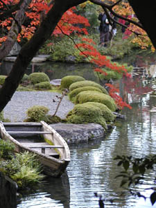 | 園池中島に寄り添う小舟 |