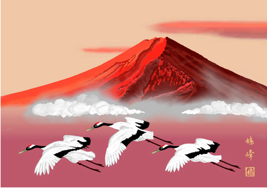 水彩で描いた 『双鶴』 を、PC画にて仕上げ