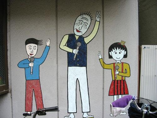 某カラオケ店にある壁画。まるちゃんも、花輪君も、おじいちゃんも、みんな大いにカラオケを楽しんでいます。ただ、おじいちゃんの安否が心配でなりません。手遅れになる前に、早く救急車を呼んであげて!!