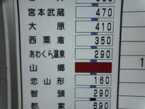 一見すると普通の料金表だが、西粟倉と山郷に挟まれた駅は何て読むのか?残念ながら、管理人の貧弱な国語力では解読できん・・・・。この文字を解読できたという方はご一報いただきたい。