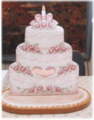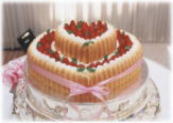 ウェディングケーキ。 ハートの二段型で、周りをビスキュィで囲んでもらいました。 上にのっているのはイチゴとミントです。 |