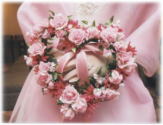 | Wドレスの上からピンクのショールを羽織って、ヘアチェンジをした時のブーケ。 ピンクのバラとガーベラでハート型にしました。 ドレスのお店で購入したもの。 |