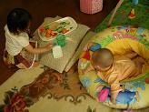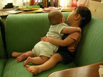 ソファーに娘を座らせて、息子を上に置いてあげます。