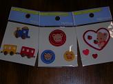左から順に、汽車、丸にクマ、ハートの中にクマのデザイン。