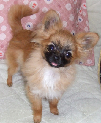 | チロルは… | 来た時は300gのチビでした。チロルを見た人の第一声がほぼ100%「…何これ!!?」。手足は小指より細かったけど、丸々してて元気!一生懸命に走っても上に跳ね上がるだけでなかなか前に進まず…。よく「電池で動いてるみたい」と言うけどもチロルの場合は電池で動くようなスムーズな動きではないので「壊れかけのゼンマイ仕掛けみたい」でした。友達に「何と何のMIXだっけ?」と聞かれ「ポメとハムスターのMIX」と言ったら疑いもなく信用された(ポメとハムスターでは子供は産まれません…)。来た当初はどう見てもポメの子犬だったのが鼻が伸びてきてコウモリ→子供の毛が抜けて猿→耳が大きくなってリカオンというようにどんどん風貌が変わっていきました。これからどう変わるのかな? | ||