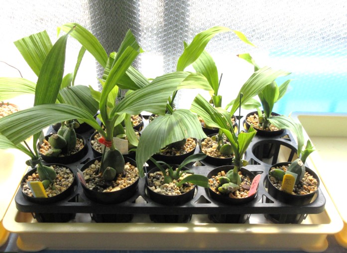 消毒と表土の交換、施肥、オルトラン&バルブに石灰水の塗布をしました。 手入れが終わったので温室に戻します。