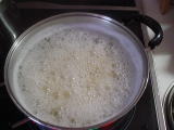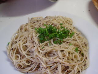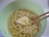 茹で上がったパスタにバターを絡める。 塩コショウもする。