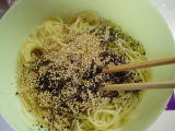 ゆかり、しろ胡麻を 混ぜ混ぜ〜〜 "\( ̄^ ̄)゛ハイ!! 簡単スパの出来上がり〜〜♪ お好みでねぎを・・・(↑の写真)