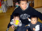 | 大掃除&ママDOWN(平成15年12月23日) 今日は、朝からパパは大掃除、ママはクリスマスケーキのスポンジを焼きました。パパは ママの手が届かないエアコンや換気扇の掃除をしてくれました。ママのスポンジケーキも おいしそうに焼けました。昼になると、ママはしんどくてしばらくお昼寝しました。その間 パパは、洗濯物やお風呂掃除など家のことをしてくれました。夜ご飯は、近所にたべにい きました。この時にパパはママが去年作ったニット帽をかぶりましたが、おーちゃんは帽子 をかぶったパパをみておお泣きしちゃいました。違う人に見えるのかなあ? |
