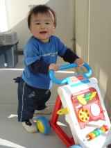 ベランダで遊びました。(平成15年12月14日)今日は、お昼からベランダで手押し車を押して遊びました。端までいくと、 おーちゃんは自分で上手に方向転換をしていったりきたり(^○^) 6往復ぐらい して、もう中へ入ろう!と抱き上げたら、手足をばたばたさせて泣いて抵抗 しました(´へ`;) 仕方がないので、もう2往復しました。 |