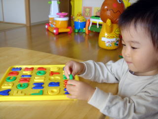 アルファベット。(平成16年11月8日)おーちゃんはアルファベットに興味があります。なので、パパと ママは100均でABCボードを買ってあげていたのですが、今日も 『えーびーしー(ボードで遊ぶ)』と言うので出してあげたら、 ランダムでアルファベットを一つ一つ手に取りながら、その アルファベットを声に出して読んでいました。 ほんの一月前には5つぐらいしかわからなかったアルファベット でしたが、今日はどんどん手にとって読んでいく〜!!!結局3つほど読めなかっただけで した(^-^) 子供の吸収力ってすごい!!とママはびっくりしました〜(^o^) |