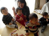 三日連続!(平成16年2月12日)![]() おとといはひなちゃんが少ししか遊べなかったので、今日も 午後から遊びました(゜▽゜*) 今日はこうきくん(2歳半)と ひなたくん(5ヶ月)も参加! 子供は総勢7人(^^)v 狭い我が家 はちょっとした託児所のよう! 一歩歩けば子供ちゃんを踏み そうな状態・・(笑)。こうきくんは、自分も遊びながらも小さい 子の面倒を見たりして、お兄ちゃんぶりを発揮してたよ(*' '*) ひなたくんは、大勢の人にも泣くことはなくって、愛想を ふりまいていました(^-^) おーちゃんにもこんな頃があったんだよな〜とママはしみじみ。 みんなそれぞれ一生懸命遊んでました。おーちゃんは、ちょっと不調(T0T) ぐずぐずいってなかったのは、いちごを食べてる時だけでした・・。 |
