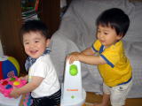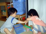 ひなちゃんと遊びました〜♪(平成16年6月9日)今日、ひなちゃんママから夏の味覚すいかをいただいちゃい ました(^-^) そして一緒に遊んでもらいました。二人は仲良く、 時にはおもちゃを取り合いながら(笑)遊んでいたよv(^^)v 中でも二人して大笑いだったのが、洗濯バサミの渡しっこ・・。 仲良く渡し合いをしていたので、ママ達は大笑い!! すいかもおいしくいただきました♪ひなちゃんママありがとう☆ |