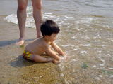 海に行きました♪(平成16年8月8日)今日はおーちゃんの調子もよかったので、うちから車で5分の 誰もいない(笑)と評判の海水浴場へ行きました。ママと入った 最初は怖がったものの、パパとだったら結構沖まで歩いて行き ました。でも波打ち際で波を待ってるのが一番楽しそうで、波 がくるたびに『きゃっきゃ♪』と嬉しそうでした(^-^) 初めてだし、病み上がりなので20分くらい遊んで帰りました。 |