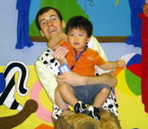 | 体験教室。(平成16年8月27日) 今日は、二つ目の英語の体験教室に行ってきました。今日はネイティブの男の先生で、 1回30分の授業。親子一緒の教室で、7組の親子が楽しんでいる教室でした。おーちゃん が一番小さくて、3歳くらいまでの子供たちがいました。最初おーちゃんは場所見知りを している感じで、ママにべったりでしたが、最後には先生に『Give me five(先生の手のひら をたたく)』をしにいくほどになりました。 火曜日には女の先生の教室を体験しに行って、 教室をどうするか決めたいと思っています(^-^) |