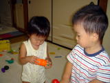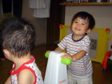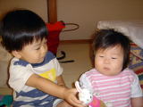 お泊りに行きました。(平成16年9月27日)今日は朝から、バスと電車にのってお友達のくみちの家に行き ました(^-^) おーちゃんはとてもいい子に乗り物に乗れたよ〜♪ もんちちゃんに会うのは約1ヶ月ぶり! おーちゃんは仲良く もんちちゃんと遊べました(^^) おーちゃんはもんちちゃんの アンパンマンカーが大好きで、ずーっと乗っていました。 昼寝をほとんどしなかった二人は8時過ぎには寝てしまい ました・・。 そのあと少ししておーちゃん大泣きしてしまって、夜泣きしたら どうしよう〜(;^_^Aって思っていたけれど、それからはよく眠ってくれました(^-^) |
