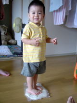 | 保育園交流会。(平成16年9月14日) 今日は月1回の保育園の園庭開放日で、園児と交流できる日。ママとおーちゃんで 行ってきました(^-^) おーちゃんはついて早々、砂場で遊びドロドロになりました(^^) 靴もドロドロになったので脱がせたら、裸足では歩いてくれません(;^_^A 仕方なくそのドロ ドロを履いて遊んでいました(苦笑) 今日はとっても暑く、ママたちはみんなバテていま した(-。-;)でも子供たちはみんな元気!! おーちゃんもず〜っと車を押しながら走って いたよ・・(^^;) 午後からはパパが残っていた夏休み休暇を使って帰ってきました。おーちゃんはお風呂に 入った後、ご飯も食べずに爆睡・・。しばらく寝てから起きて昼ごはんを食べました。 そして3人でジャスコにお買い物に行きました。おーちゃんはずーっと動きっぱなしで ママは大変(+。+) 買い物はパパ任せでした・・。 |
