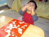 小麦粉粘土遊び。(平成17年1月5日)今日おーちゃんは、ママと小麦粉粘土遊びをしました。2日前に 遊んだ時は、作りたてでちょっとやわらかくて、おーちゃんあんまり 触ってくれませんでした・・(手が汚れるのが嫌いなのです・・。) 今日、遊んでみるとちょうどよいカタさ!! ママとケーキを 作ったり、パンを作ったり、型抜きをしたりして遊んだよ♪ 途中ママが眠くなって、『もうおしまいにしよう〜』と言っても 『いやっ!』ということだったので、ままはしばらく横でウトウト(;^_^A 30分くらいして 起きて見ると、写真のようにたくさんちぎってありました(^^;) どうやらパンを作っていた らしく、食べるまねをしていたよ〜(^-^) ちぎった粘土はカピカピになっていたので、ゴミ箱 行きになりました(^^) また粘土作ってあげるから、遊ぼうね♪ |