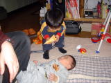 京都へ。(平成17年2月11日)今から日曜日まで、京都のパパの実家に帰ってきます〜(^-^) 途中ご飯を食べて、お昼2時くらいに京都に着きました。 その足で、パパのお姉さんの家へ〜。シンちゃん(7ヶ月)が大きく なってる〜(^-^) お座りしていろいろなおもちゃに手を伸ばして、 お口に持っていってました(^^) お姉さんの家には、ミニチュアの 車やバイクがたくさんあっておーちゃんはうれしそう♪ ちゃんとある場所を覚えているようで、家に着くなり手を伸ばして遊んでいました(笑) 夕方まで、たくさん遊ばせてもらってバイバイしました(^-^) そしてばあばのお家へ〜。 外観を見るなり『はっ!ばあば〜。じいじ〜』と言って興奮(笑) 『お帰り〜』と言ってお家に 入っていきました(逆ですけど・・) ばあばはお家にいたけれど、じいじはまだお仕事中。 おーちゃんはじいじがいないので、一生懸命『じいじ〜!』と言って探していたよ(^^) じいじが帰ってきてとてもうれしそうなおーちゃんでした。夕飯はみんなで鍋をつついて、 じいじと一緒にごきげんでお風呂に入りました〜(^-^) ただ、夜はなかなか寝て くれない〜(;^_^A その上夜泣きもしちゃいました(^^;) |