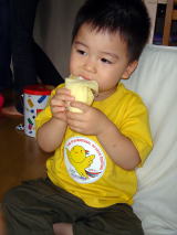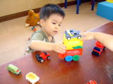 | お友達が遊びにきたよ♪(平成17年7月13日) 今日はママのお友達のマツキョが、3ヶ月のハヤ君と一緒に遊びにきてくれました〜(^-^) ハヤ君は会うたび会うたびに成長して、表情も豊かになってきてかわいい〜♪ おーちゃんも、今までは赤ちゃんを見て固まっていただけだったけれど、このくらいの月齢 だと笑ったりしてくれるので、とても興味があって近づいて触ったりしていました(^^) おーちゃんはマツキョが大好きなので、すごくはしゃいでしまって大変!! ママは おーちゃんがおもちゃを乱暴に扱ったり、タオルを振り回したりするたび怒っていたよ(-。-;) おーちゃんはハヤ君がおっぱいを飲んでる姿を見て、何度もママのところにきてママの 洋服の上からおっぱいを飲むマネをしていました・・・(;^_^A きーくんが生まれたらどうなる ことやら・・・(+。+) 挙句の果ては、自分のシャツをめくっておっぱいを出し『おーちゃん のおっぱい たべて〜!』と言いだした〜!! これを聞いたママとマツキョは大爆笑 でした(≧∇≦) |