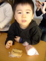 | 親子ふれあい講座(平成18年2月10日) 今日は町の子育て講座『親子ふれあい講座』(どれみくらぶ、カンガルー合同)で、 『親子クッキング』ということで、アンパンマンのクッキーを作りました。 今回は約40組の参加ということで、会場に着いた順にクッキーの材料(もう生地は 作ってありました)をもらい、親子でアンパンマンの形に仕上げるということでした。 が・・・・、おーちゃんエプロンつけて手を洗ったまではよかったのですが、一度生地を 触っただけでもうお友達と走り回りだした(;^_^A 仕方ないので、ママが作りました(T0T) (きーくんはその間、畳の上で号泣していました(;^_^A) それから15分オーブンで焼いたらできあがり〜(^-^) 上手にできたよ〜v(^^)v おーちゃんもおいしそうに食べていました(^0^) きーくんの顔の湿疹がまたひどくなってきました。先生の示指で一日おきに薬を塗る ということですがひどくなってきたので、近いうちに受診しなきゃ〜と思っています。 体の湿疹もここ何日か目だってるので(ママはこれといってゴマを食べた記憶はないし、 離乳食もたんぱく質はまだあげてないので、原因がわかりません〜)ちょっとかわいそう です・・・・。 |