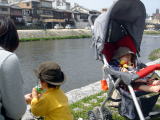 鴨川でおやつ。(平成18年4月24日)今日はママが家事をする間、トモコがおーちゃんときーくん と遊んでくれていたのでとってもはかどった〜(^-^) 家事の後、 まっぷる京都を見ながら『今日はどこへいこうか?』と相談。 河原町に向けて出発しました。 高島屋の駐車場に車を止め てまずお昼ごはん。おいしい点心をごちそうになりました(^^) そのあと町をブラブラしながら祇園へ。 それにしても平日だと いうのに人が多い〜!!さすが京都、外国人もたくさんいました。 祇園から河原町に 帰るときにおいしそうな団子屋さんで、お団子を買い、鴨川沿いで食べる事に♪ これまたたくさんの人が川べりに座って春を満喫していた〜(^-^) おーちゃんも2本団子 を完食!! きーくんも気持ちよさそうにウトウトしていました(最後起きたけど) 川沿いのお店にはぼちぼち川床が(^^) 一度行ってみたい〜〜!! 思いっきり観光客したママとおーちゃんきーくんでした(笑) |