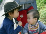 きーくん初節句(平成18年5月5日)きーくんの初節句です!といってもおーちゃんのときも これといって特別な事をしなかったので、きーくんも 別になにも・・・(苦笑) じいじに二人とも新聞紙でカブトを 折ってもらいかぶりました〜。 今日はひいばあちゃんのお見舞いにじいじと家族みんなで 行ってきました。 ママは約一年ぶり。きーくんは初対面です♪ おーちゃんは『おはぎを あげる〜』と言って嬉しげに行きましたが、いざ会ってみると人見知りで、おはぎも手渡し というよりちょい投げであげる始末・・・(汗) ずーっとじいじの後ろに隠れていました(^^;) その後、安産祈願をしていたお寺にお礼参りに行きました。やっと行く事ができた〜☆ 帰ってから、ママとおーちゃんきーくんでお散歩へ。タンポポの綿毛を見つけてきーくん に吹いてみせてくれたおーちゃんです(^-^) |