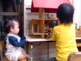 歯がはえたよ!/園庭開放(平成18年5月16日)とうとうきーくんに歯がはえて来ました。実をいうと、 おーちゃんの歯は早く生えてきてかなり虫歯にならない ように(よだれがほとんど出ない子だったので)神経を使って きたので、きーくんはなるべく遅くまで生えないで〜と思って いました(苦笑) でもとうとうこの日が〜(笑) これからどんどん生えて くるんだろうなぁ。これも成長の印だね♪ 今日はまた別の幼稚園の園庭開放の日。 ここは登録料が1000円いるのですが 火曜・木曜の週二回の午前中園庭開放をしてくれています。問い合わせをすると 『取り敢えず一度来て見て、続けてこれそうな感じでしたら登録していただく形で いいですよ』とのことだったので、さっそく今日行ってきました。 すごくこじんまりとしていて、おーちゃんもじもじすることなくすんなりと遊びはじめ ました。 まず、年中のお姉ちゃんと一緒にシルバニアファミリーでお人形遊び。 すごく優しい子で、おーちゃんに『何歳かな?』とかいろいろ聞いてくれました(^-^) その後は、マトリョーシカにはまり(バムとケロと一緒だ〜とか言って・・・笑) スタンプ押しにはまり、ブリオの列車にはまり・・・。 時間になっても帰ろうとは せず、とうとう『おーちゃん、泊まるわ〜』だって(;^_^A なだめすかして帰ってきました(^^;) きーくんもちょこちょこ遊んでいました〜♪ ママも同じく初回だった他のママと楽しくおしゃべり〜♪本当に楽しかった(^-^) |