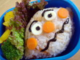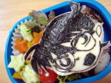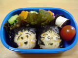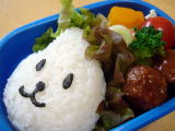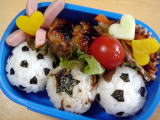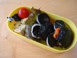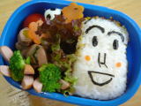 コナン弁当(平成19年6月12日)*今日のお弁当* ・ コナンのキャラシート(のり・チーズ・ハム) ・ くぎ煮おにぎり ・ かぼちゃとにんじんの煮物(夕飯の残り) ・ タンドリーチキン(鶏肉・パプリカ) ・ きゅうり、ぷちとまと 今日は前日に作っていたコナンシートをおにぎりに乗せただけ。 このキャラシートは作るのにかなり時間がかかるけど、その分朝はとても楽♪ コナンの キャラシート・・・・目が難しかったし、めがねもなんかゆがんでる〜・・・。 落書き張の表紙 のコナンの絵をクッキングシートに写して作りました。 おーちゃん、コナンには大喜びだったけど、おかずはほとんど残してきた! ちょっと普段 見慣れないもの(タンドリーチキン)とか苦手なかぼちゃとかだと本当に食べない(泣) |