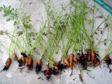 にんじん収穫/きゃ〜んと・まいん(平成19年6月30日) 今日は、おうちのプランターで育てていたミニキャロットを収穫 しました〜。 本当はもう少しおおきくなるのかもしれないの ですがアブラムシが大量発生して葉っぱがほとんどなくなって しまった〜!! なので早めに収穫。おーちゃんはにんじんを 抜くときすごく嬉しそうだったよ♪ さっそく夜ご飯のサラダに 使いました。でも、おーちゃん「硬い!」と言って食べてくれなかった・・・。きーくんは むしゃむしゃ食べていたのに! すごくおいしいにんじんだったよ☆ まだ種が残っているので、今回はちゃんとあいママさんに教えてもらったアブラムシ 対策をして、ちゃんと育ててみようと思います〜☆ 最近きーくんが使い出した英語・・・自分でしたいけれどできないことが多いきーくん。 例えば、重たいチョロQの道路を机まで運びたい時や、パズルがはまらないとき 「あい きゃーんと!」とか「きゃーんと!」って言っています。 今日は、おーちゃんに自分が使っていたペンを取られて「NO〜!まい〜ん!まい〜ん!」 と自己主張していました。 |