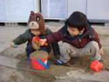 久しぶりに公園(平成20年1月16日)今日はおーちゃんが午前保育。 ママも風邪がよくなって きたので、久しぶりにお昼から公園へ行きました。 寒いのに、水を使って砂場で泥遊び・・・。どろどろになって 遊んでいたよ〜。 砂場に飽きたら、滑り台を滑ったり、 シーソーで遊んだり、一時間くらい公園が日陰になるまで 遊んで帰ってきました。 |