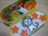 パパのお誕生日/今日のお弁当(平成20年1月22日) 今日はパパの29回目の誕生日です。 おめでとう〜!! 今夜はちょこっとお祝いしたいと思います♪ 夜、ご飯を食べて買ってきたケーキを食べたんだけど、いまいち のケーキだった・・・・(泣) それにもかかわらずパパはたくさん食べてくれました。 *今日のお弁当* ・ ブルーナさんのライオンくん(名前がちゃんとあるのかな?) のキャラシート (のり、チーズ、ハム) ・ 大根とニンジンと魚のツミレの煮物、 ウインナー、 ・ 焼き芋、 型抜きニンジンとパプリカ、 ブロッコリー、 プチトマト、 キャンディーチーズ ・ みかん 鹿児島からのプレゼントの中に、ふりかけの大袋が入っていたので大喜びでふりかけを もって行きました。 |