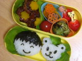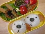 お弁当が始まりました(平成20年4月17日)おーちゃん今日から通常保育開始です。 久しぶりのお弁当 でした。 キャラも考えてたのですが、昨日準備する時間が なかったので簡単に「おーちゃんのお顔とくまさん(くま グループになったので・・・年長さん)」にしました。 全部食べてきてくれるかな? *今日のお弁当* ・ お顔おにぎり (のり、 ふりかけ持参) ・ ハンバーグ (ミンチ、玉ねぎ、パプリカ) ・ かぼちゃの煮物(かぼちゃ、ニンジン) ・ きゅうりの漬物(きゅうり、塩昆布) ・ プチトマト、 イチゴ |